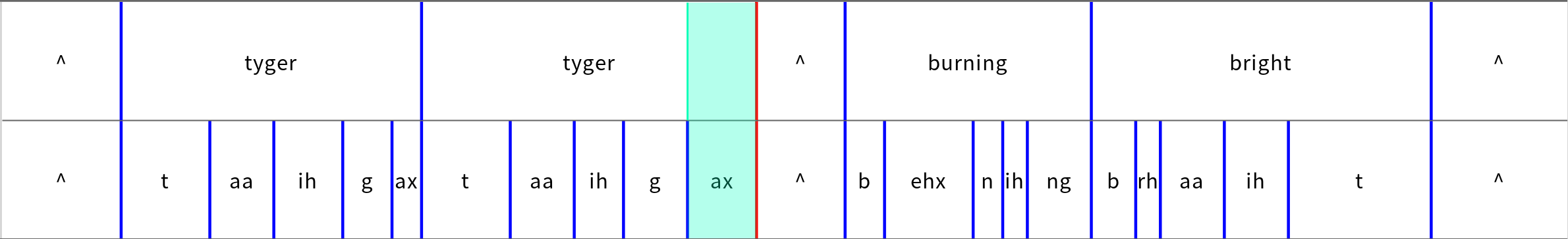 And on the second (word) tier, the red boundary marks the end of a segment[tyger], which starts at the preceding boundary on the second tier: