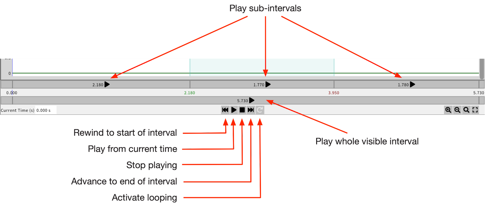 There are two play bars. The bottom plays the entire visible interval of the event. The top is similar but is divided into sub-intervals, based on the current boundaries of the selected interval (see Time selection).