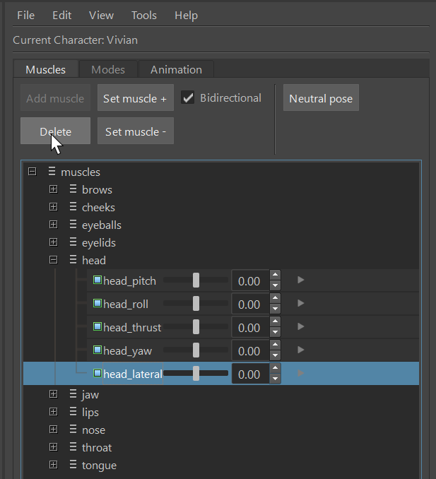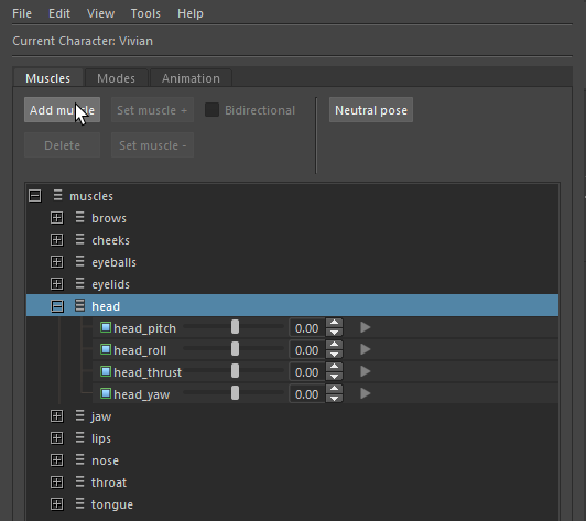 The slider next to each muscle sets the current activation – in the range [0,1] for uni-directional and [-1,1] for bi-directional muscles. The character in the scene will react in real time to the manipulation of these sliders. This is helpful for visual evaluation of the muscles or using them to help create other poses.