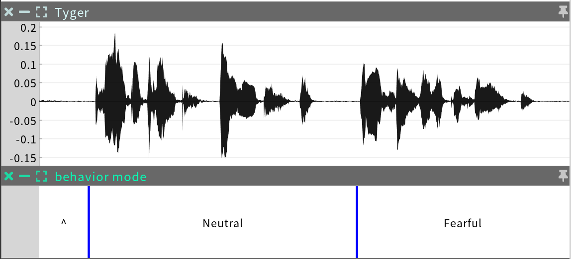 Expression labels are paths in the expression tree of the character. For example, “Fearful/low/3” in the sequence above refers to expression ”3” in the low-tone subset of the behavior mode “Fearful”, as shown below in SGX Studio.
