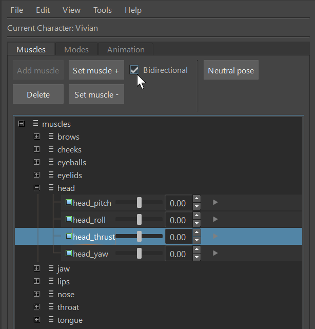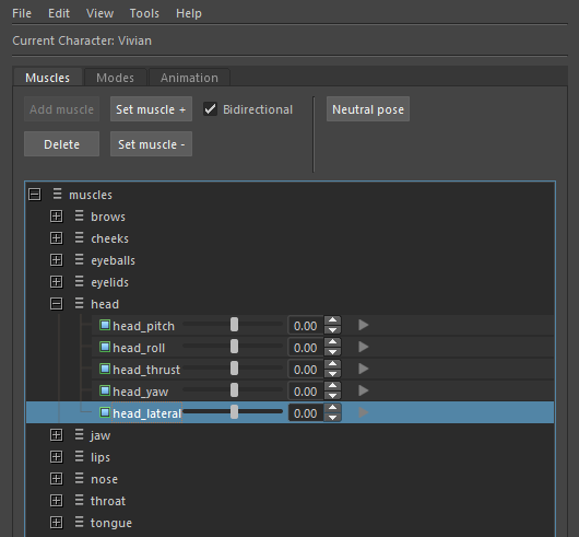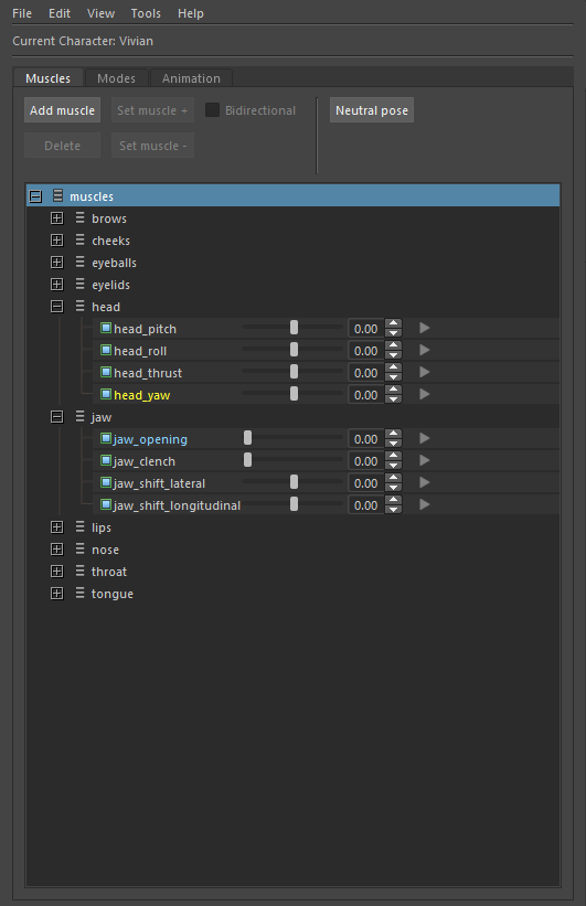 The slider next to each muscle sets the current activation – in the range [0,1] for uni-directional and [-1,1] for bi-directional muscles. The character in the scene will react in real time to the manipulation of these sliders. This is helpful for visual evaluation of the muscles or using them to help create other poses.