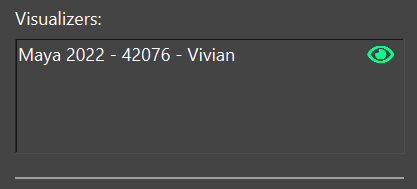 上記の操作が完了すると、StudioとDirectorが自動的に接続されます。Directorでイベントを開くと、Studio Mayaのインスタンス(プロセスIDとキャラクター名を含む)がDirectorの[Inspector]パネルの[Visualizers]セクションに表示されます。赤い目のアイコン(左)は、そのイベントが現在、ビジュアライザにバインドされていないことを意味します。ビジュアライズを有効にするには、目のアイコンをクリックします。接続処理中は黄褐色になり、接続が完了すると緑色になります(右)。