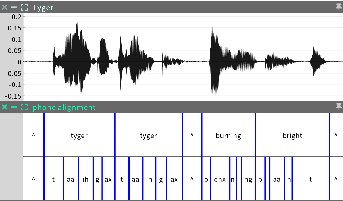 言語音の位置合わせは単語の位置合わせに似た分類別時系列ですが、単語を構成している言語音(子音と母音)の下位区間も含まれています。単語の位置合わせと同様、このシーケンスはスクリプトを使用しているイベントでしか表示されません。[^]は空のラベルで、無音または言葉ではない音を意味します。