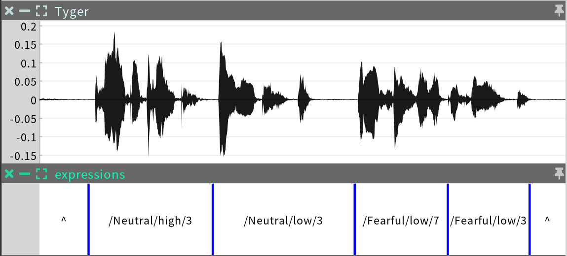 フレーズシーケンスは、タイムラインを、話されているフレーズに大まかに対応する区間に分割する分類別時系列です。各フレーズは、スピーチの抑揚に基づいてハイトーン(H)またはロートーン(L)に分類されます。フレーズでは、エクスプレッションが割り当てられている区間が形成され、各トーンは、ビヘイビアモードがBi-Tonalの場合にエクスプレッションを選択するのに使用されます。