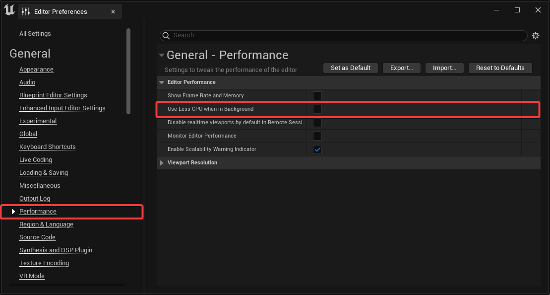 SGX Directorのコントロールを使用しながらUnreal Editorでアニメーションを表示するには、Unreal Engineの設定で[Use Less CPU when in Background]がオフになっている必要があります。この設定は、[Edit]>[Editor Preferences]>[Performance]で確認できます。