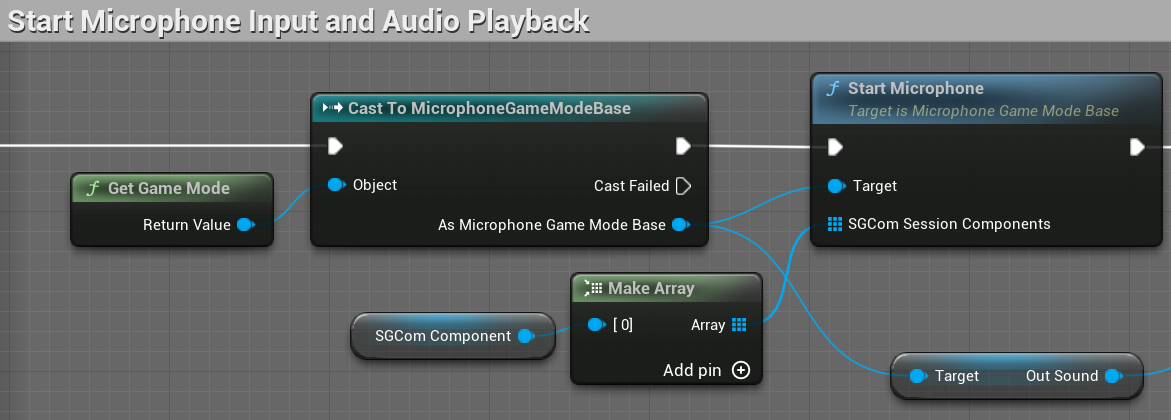 本示例设置为使用自定义 MicrophoneGameModeBase 游戏模式。本示例用 C++ 编写,使用 FAudioManager 麦克风功能通过 SG Com 会话组件将音频数据输入 SG Com。