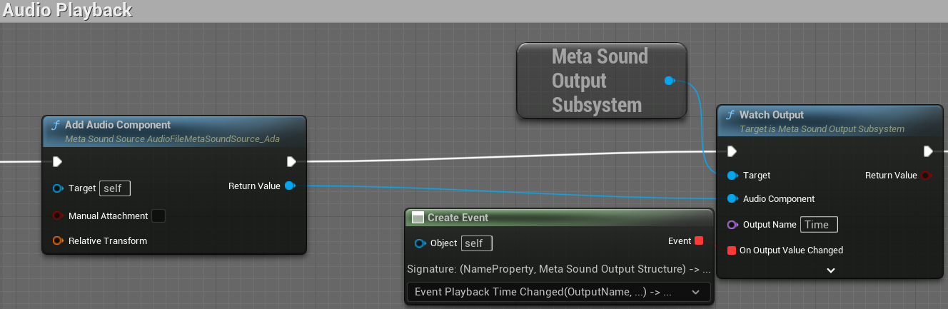 创建一个观察输出节点并将其输出值已更改回调绑定到自定义 event 播放时间已更改,这样我们就可以跟踪 MetaSound 的当前播放时间。