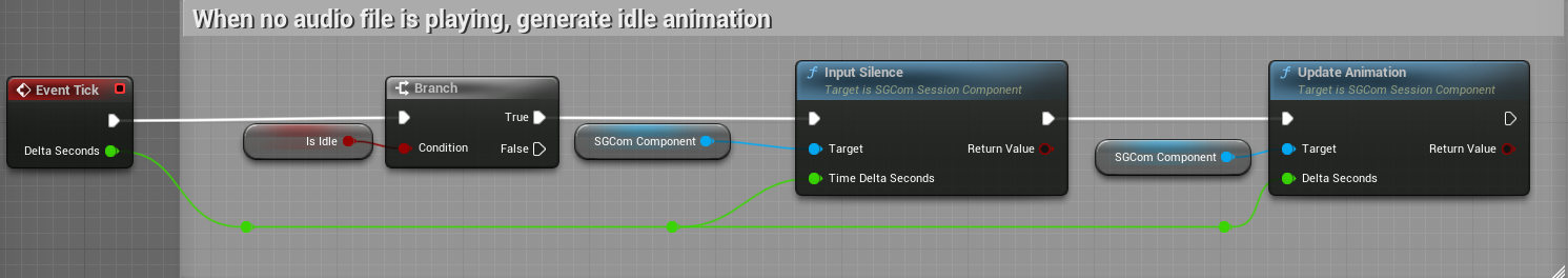 我们希望在完整播放完文件后,或中途决定暂停音频文件时,角色能继续生成动画。为此,我们需要在当前没有文件播放时向 SG Com 输送空音频数据。(请参阅引擎闲置)。