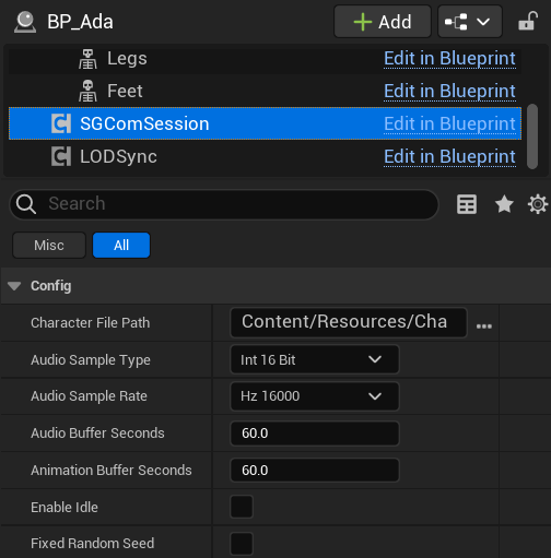 SG Com 会话组件具有多个可配置的设置(主要对应 SG Com API中的引擎配置和播放器配置),这些设置可在组件的配置类别下找到。它们的值也可以通过蓝图进行设置。