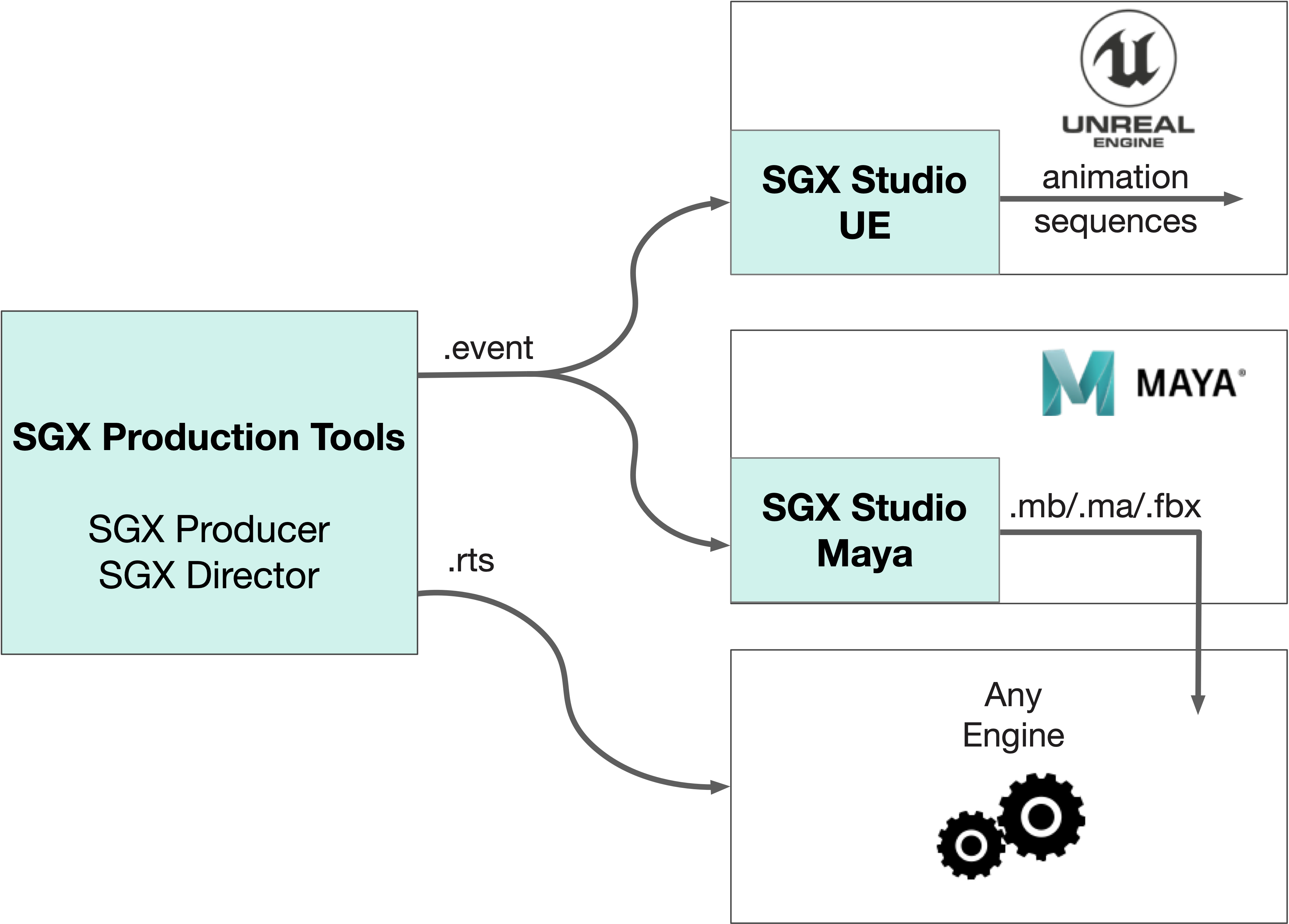 使用 SGX Studio Maya 插件将 event 文件转换为 Maya 或 FBX 文件,然后将这些文件导入任何引擎。