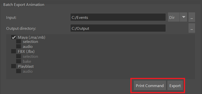 现在您可以按导出启动导出过程,也可以按打印命令,此操作将在 Maya 命令行上打印一条 MEL 命令,该命令将通过脚本执行相同的批量导出(有关 MEL 和 Python 中 SGX Studio 命令的指南,请参阅命令行界面)。