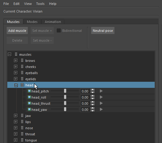 双方向性肌肉有正姿势和负姿势。默认情况下,负姿势就是正姿势的镜像,所有值都取相反值。因此,如果正姿势是头向左转,那么负姿势就是头向右转。