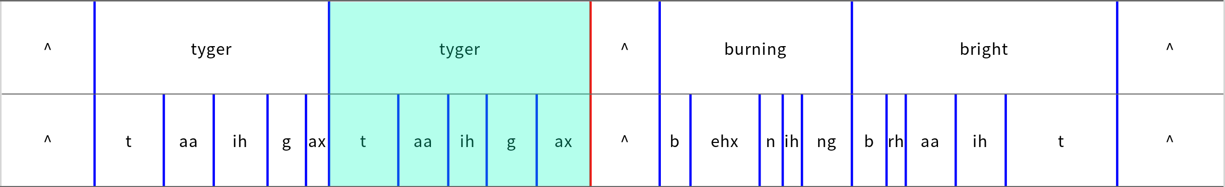 而在第二层(单词层),红色边界标记出了 [tyger] 分段的终点,该分段的起点是第二层的前一个边界: